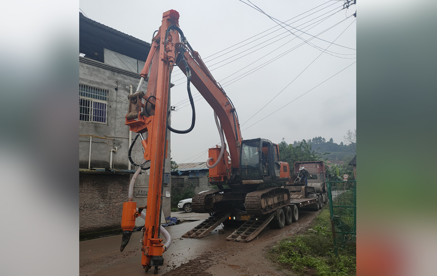 2、前后左右自由伸展,當(dāng)挖掘機(jī)在工地不平坦的情況下, 挖機(jī)手可根據(jù)位置不同調(diào)整鉆桿角度,保持90°垂直鉆孔。