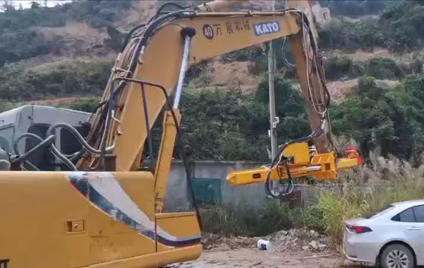 2、前后左右自由伸展,當(dāng)挖掘機(jī)在工地不平坦的情況下, 挖機(jī)手可根據(jù)位置不同調(diào)整鉆桿角度,保持90°垂直鉆孔。