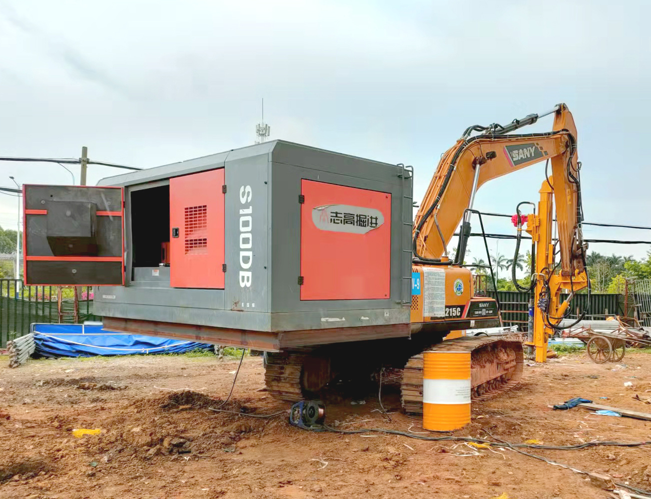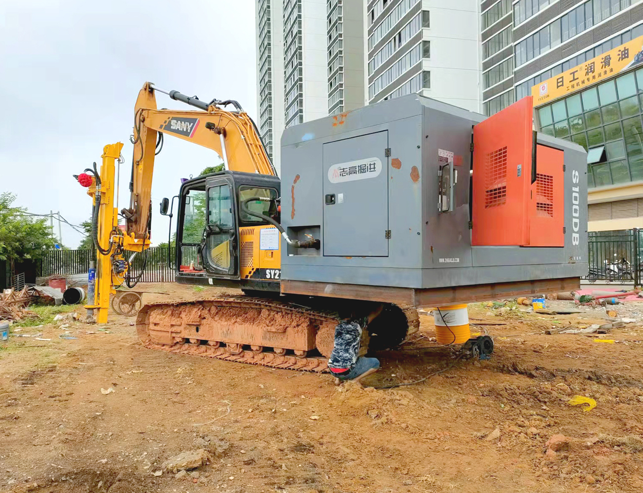 4、大功率空壓機,既可以單獨放置接氣管;也可以安裝于挖機的配重位置,與挖機鉆機自成一體,使用更為方便快捷。
